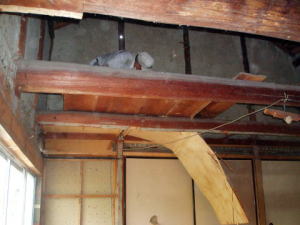 座敷の床に蔵の床を合わす為、ツシの梁を撤去します。 |