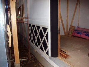外壁の下地風景、ラス地を平らに貼り、漆喰で段差(よろい)を塗ると厚みのある所と厚すぎる所が出来、厚すぎる所にヒビが発生しやすいので均等に漆喰を塗れるように、ラス下地の段階で段差をつけてあります。 |